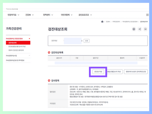 2️⃣ 왼쪽 서브메뉴에서 자녀(영유아) 건강검진정보> 검진대상조회 메뉴에서 문진표 작성을 하실 수 있습니다.