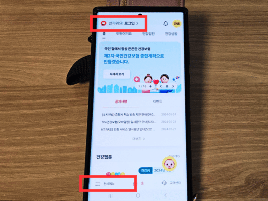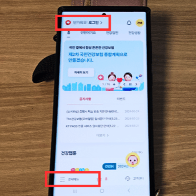 1️⃣ The 건강보험 앱을 다운로드 받아 좌측 상단 반가워요. 옆 로그인 버튼을 눌러주세요.